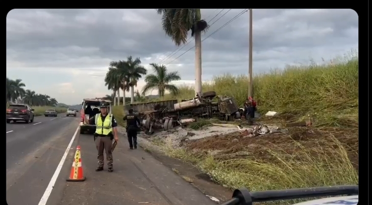El percance se registró en la vía sur de la carretera, lo que obligó a las brigadas de Provial a realizar labores de asistencia y control vehicular para evitar mayores contratiempos. Según testigos, el camión habría salido de su carril por causas aún desconocidas, impactando contra la cuneta y quedando volcado a un costado de la carretera.