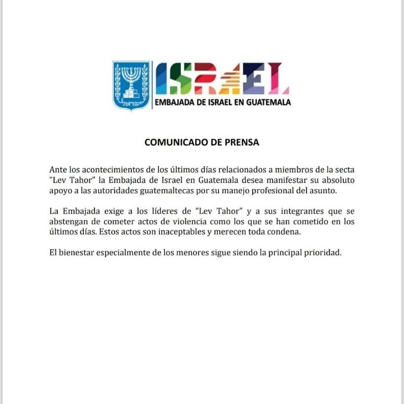 En un comunicado reciente, la Embajada de Israel también expresó su absoluto apoyo a las autoridades guatemaltecas por su manejo profesional de la situación. “Exigimos a los líderes de Lev Tahor y a sus integrantes que se abstengan de cometer actos de violencia como los que se han cometido en los últimos días. Estos actos son inaceptables y merecen toda condena. El bienestar de los menores sigue siendo la principal prioridad”, subrayó la representación diplomática israelí.