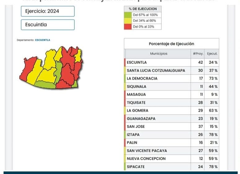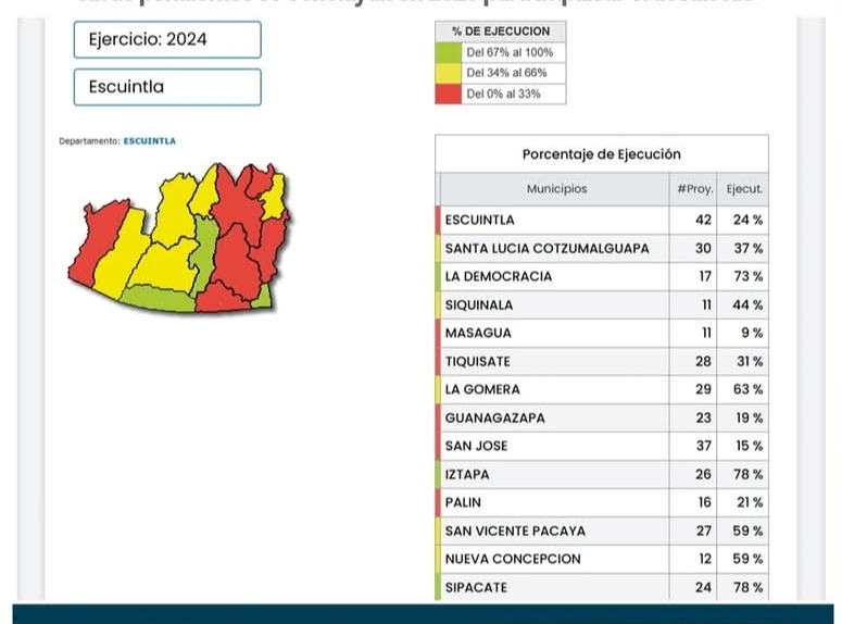 Según el Sistema Nacional de Inversión Pública (SNIP), solo tres de las 14 municipalidades lograron avances considerables: Sipacate, Iztapa y La Democracia. Estas comunas reportaron progreso en proyectos financiados tanto con recursos municipales como con fondos de los Consejos de Desarrollo. Sin embargo, las demás municipalidades quedaron rezagadas, limitando el alcance del desarrollo en la región.