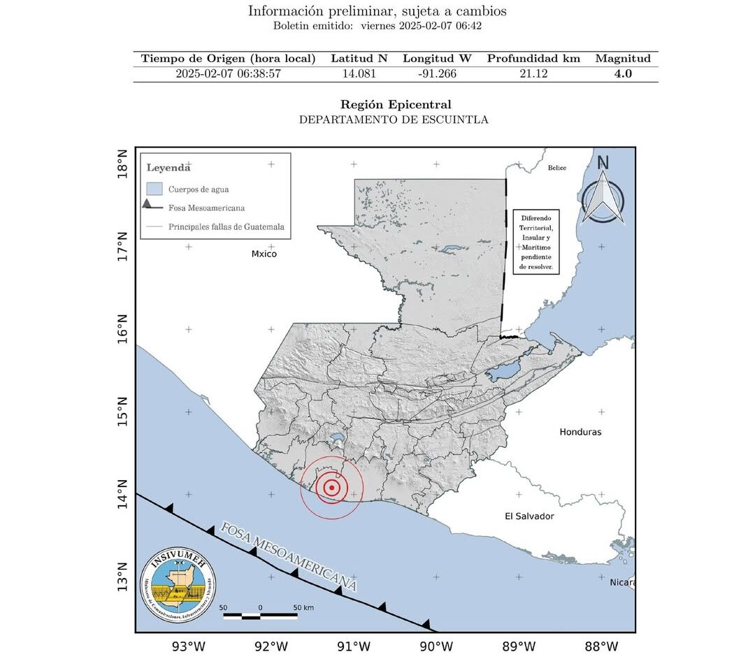 Escuintla. El Instituto Nacional de Sismología, Vulcanología, Meteorología e Hidrología (Insivumeh) informó sobre un temblor de 35 km de profundidad, registrado en el territorio nacional este viernes 7 de febrero. De acuerdo con el reporte oficial, el sismo tuvo su epicentro en el departamento de Escuintla y ocurrió a las 06:38:57 horas, alcanzando una magnitud de 4.0.