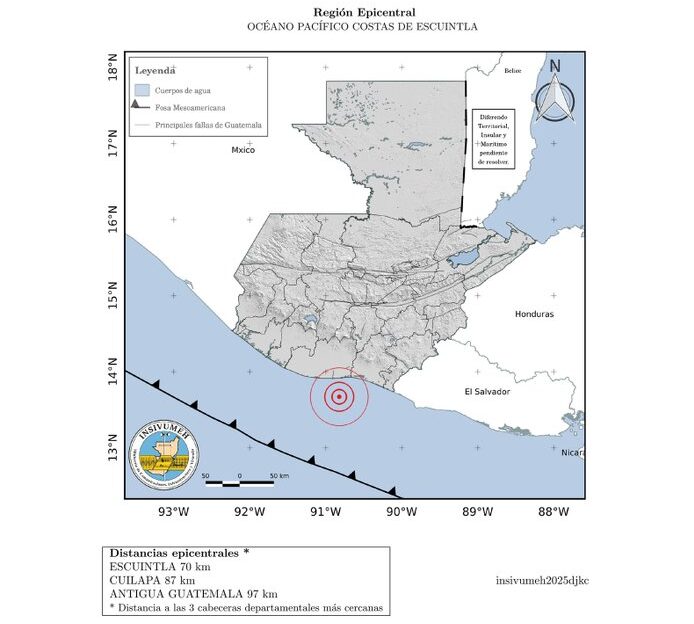El epicentro del temblor se ubicó en el océano Pacífico, frente a las costas de Escuintla, a una profundidad de 28.84 kilómetros, de acuerdo con el boletín preliminar del Departamento de Investigación y Servicios Geofísicos de la entidad.
