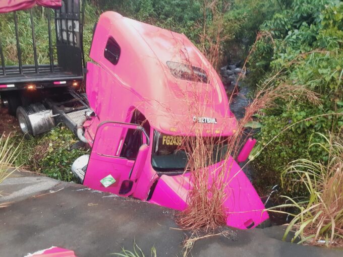 Accidente en ruta a Siquinalá deja tráiler bloqueando ambos carriles en el km 85; Bomberos Voluntarios realizan búsqueda sin éxito del conductor desaparecido....