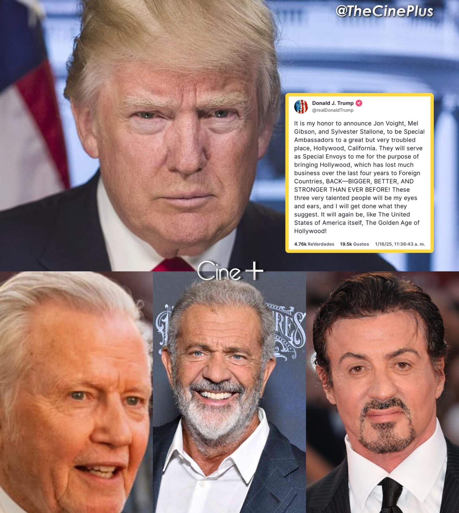 Donald Trump, expresidente y candidato republicano, sorprendió nuevamente al anunciar la designación de Sylvester Stallone, Mel Gibson y Jon Voight como «embajadores especiales» para Hollywood. Según fuentes internacionales, el objetivo de esta iniciativa es reactivar la industria del entretenimiento y reforzar su posición en mercados internacionales, los cuales, según Trump, han sido descuidados en los últimos años.